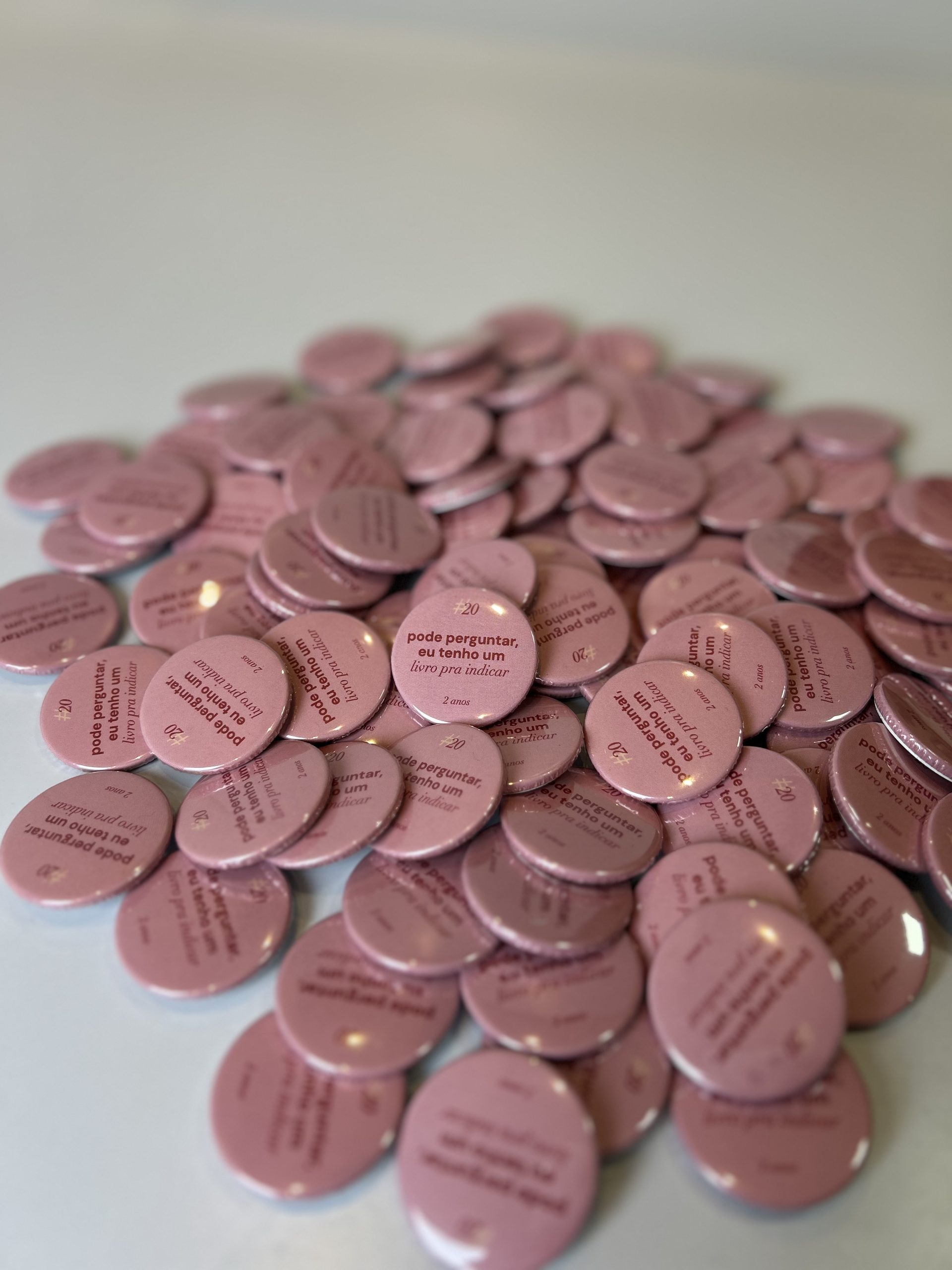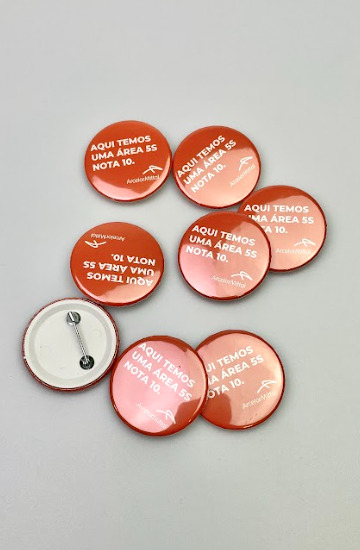 Bottons 3,5×3,5cm e 5,5×5,5cm com impressão colorida frente única (4×0) e alfinete. Arte 100% personalizada com a identidade visual da sua marca, sem custo adicional.