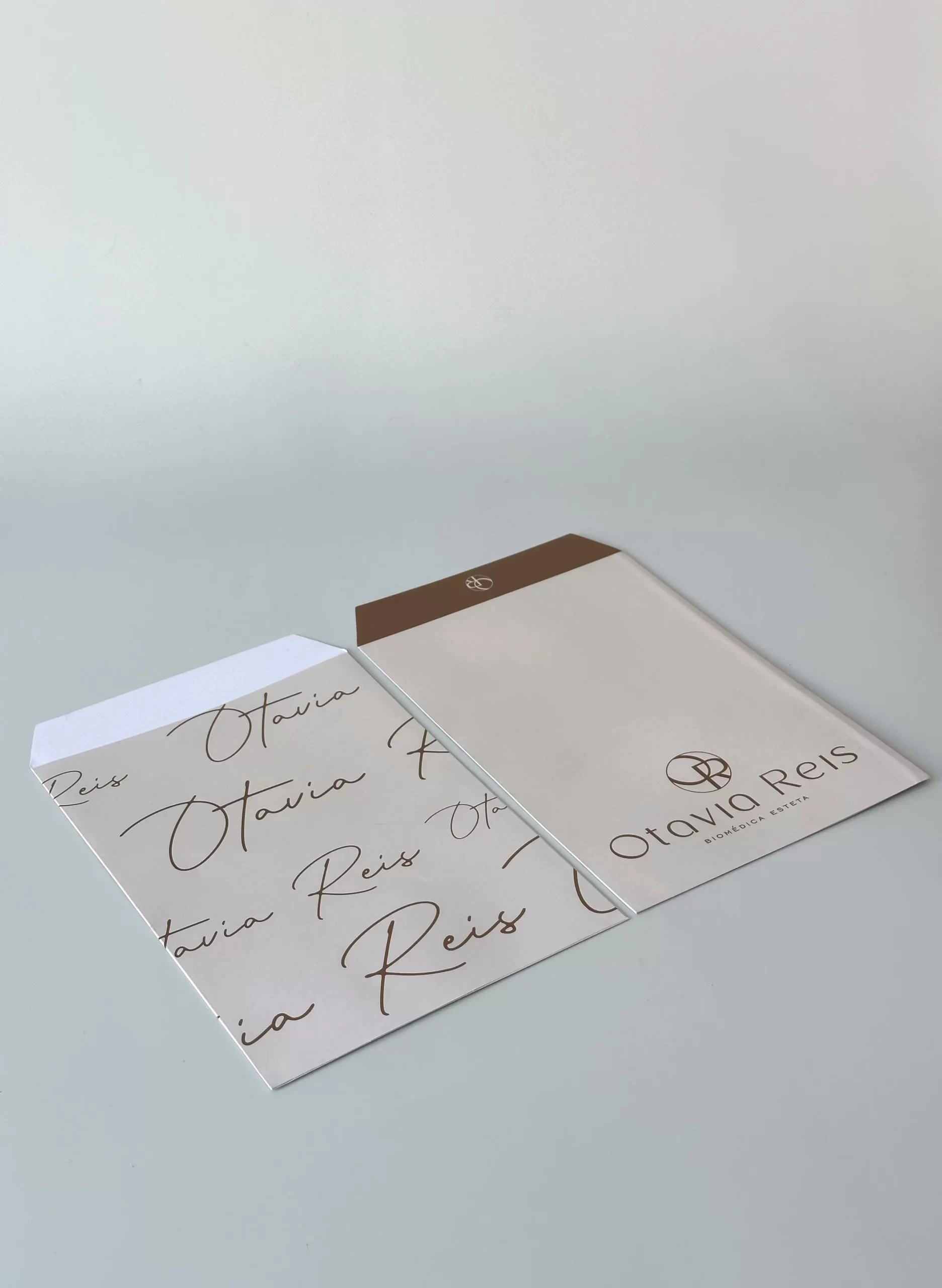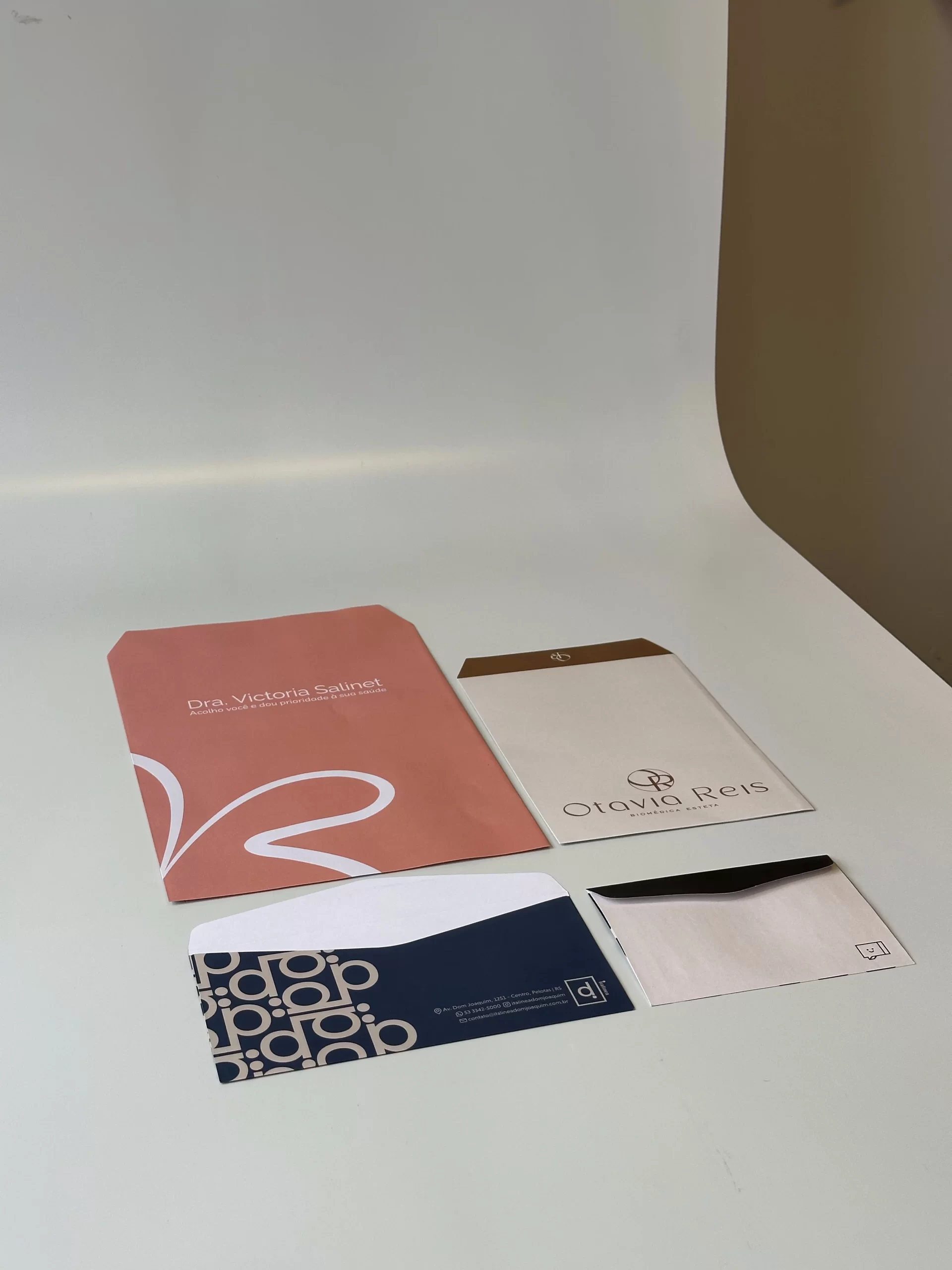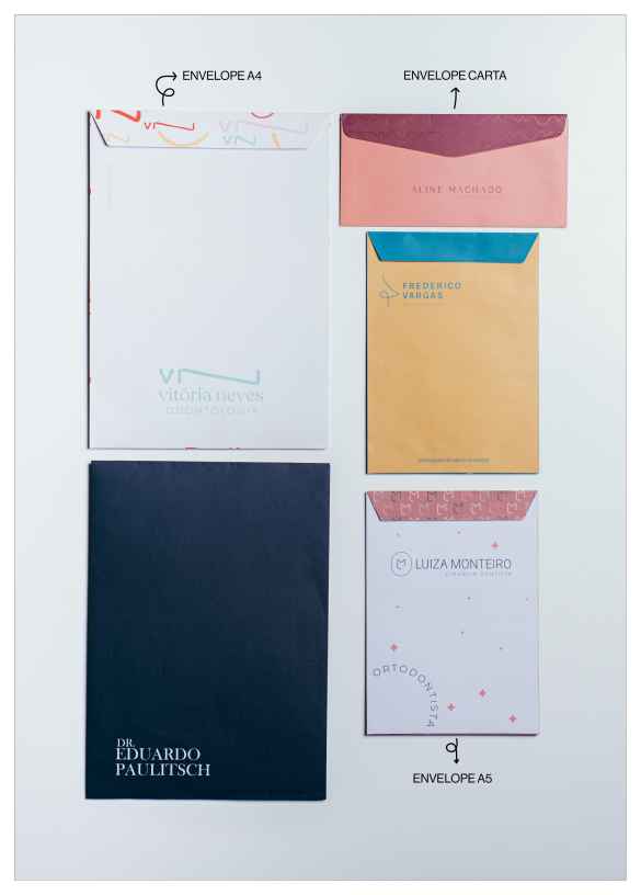 Os envelopes em quatro formatos:– Pequeno, Carta, A5 e A4 são ideais para clínicas, oferecendo acabamento profissional com corte, vinco e cola. Eles permitem que sua marca se destaque de forma elegante, com impressão externa de alta qualidade. Sua arte é 100% personalizada com a identidade visual da sua marca, sem custo adicional.