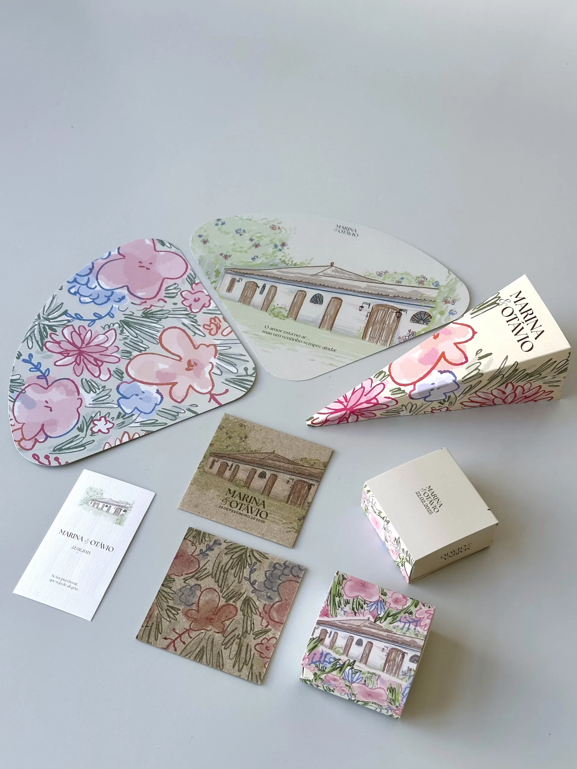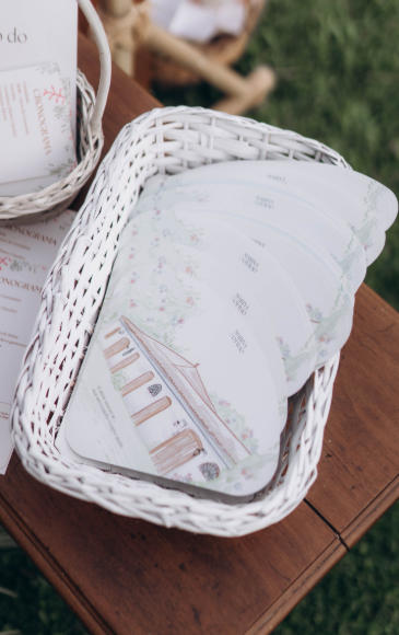 Kit completo para casamento com leque, cartão “Lágrimas de Alegria”, porta-copos, embalagem para bem-casado e cone para arroz. Personalização 100% com a identidade visual do casamento.