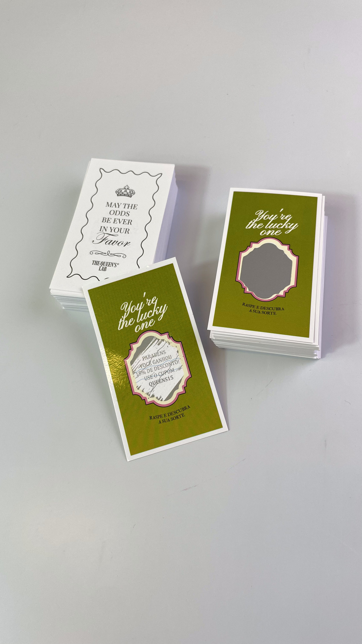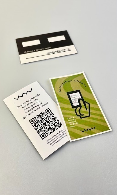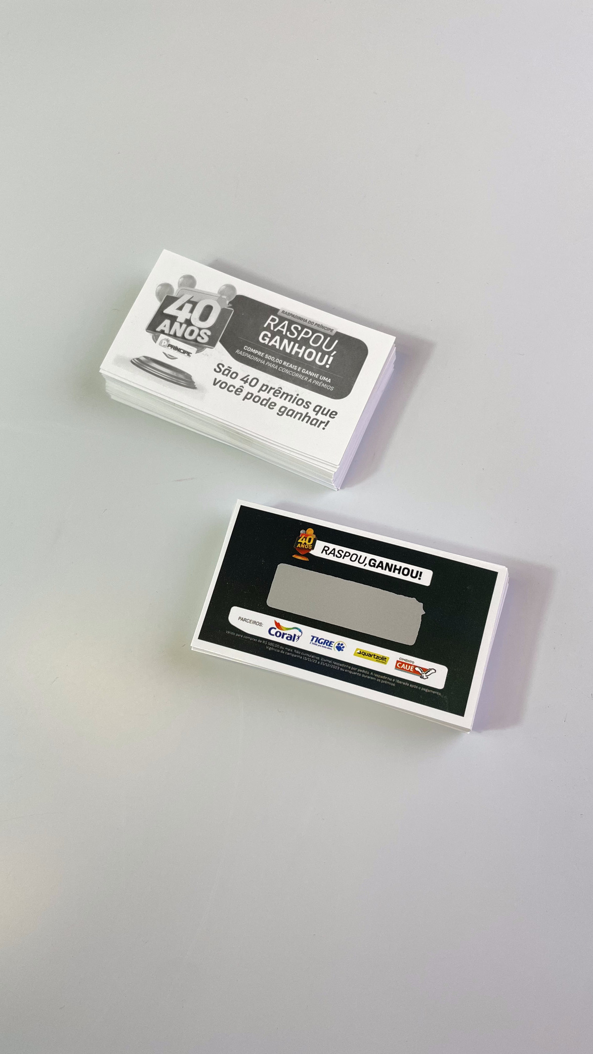 As Raspadinhas são perfeitas para ações promocionais, campanhas de engajamento e ativações criativas que fazem o público participar de verdade. Com impressão frente colorida e verso em preto e branco, no formato 5×9 cm, elas oferecem espaço ideal para comunicar sua marca com clareza e impacto. Você pode escolher até 5 prêmios diferentes, criando uma dinâmica divertida e estratégica para seu negócio. A arte é 100% personalizada com a identidade visual da sua marca, sem custo adicional.